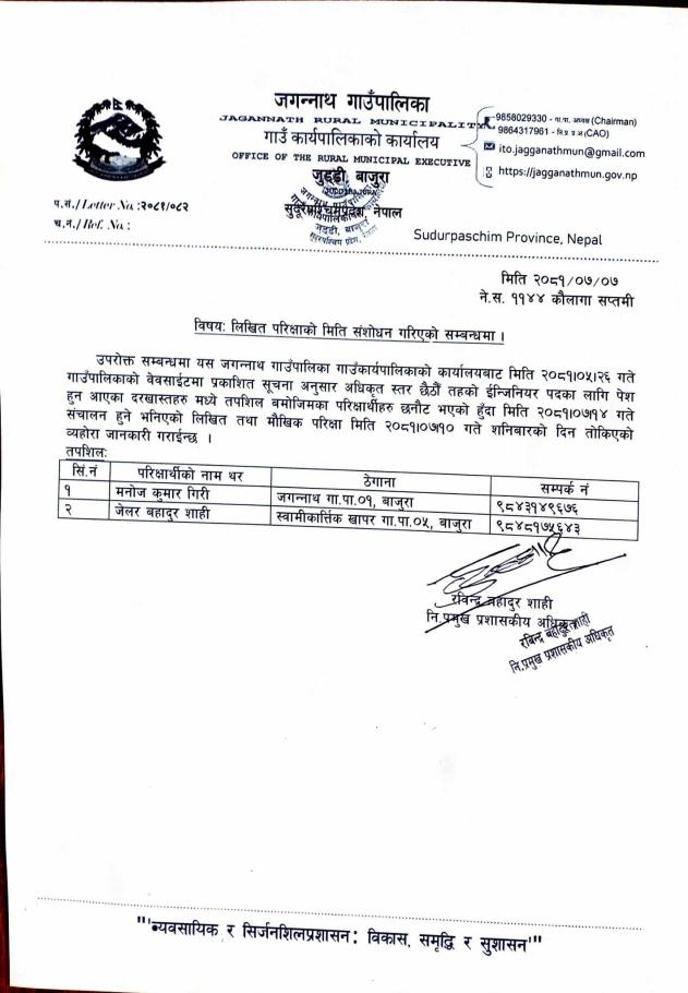 » इन्जिनियर पद करार सेवा लिखित परिक्षाको मिति संशोधन गरिएको सम्बन्धमा ।