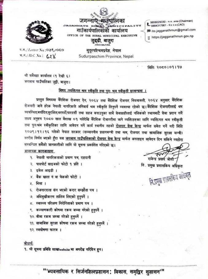 व्यक्तिगत श्रम स्वीकृति तथा पुन: श्रम स्वीकृति सम्बन्धमा जगन्नाथ गाउँपालिकाद्वारा जारी गरिएकाे सुचना ।